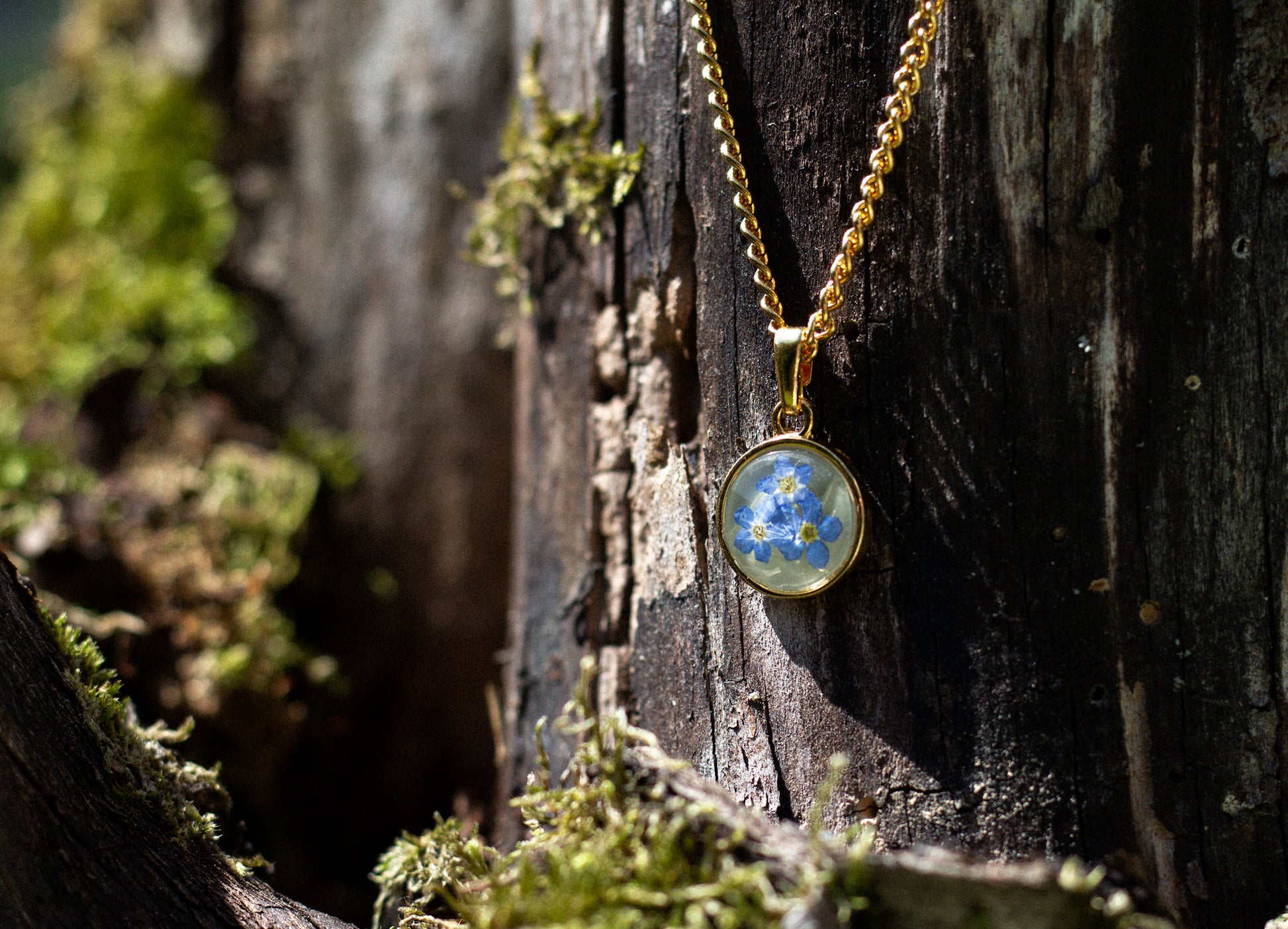 Material: 24k Gold plated brass I claw clasp I dried forget-me-not flowers I resin
