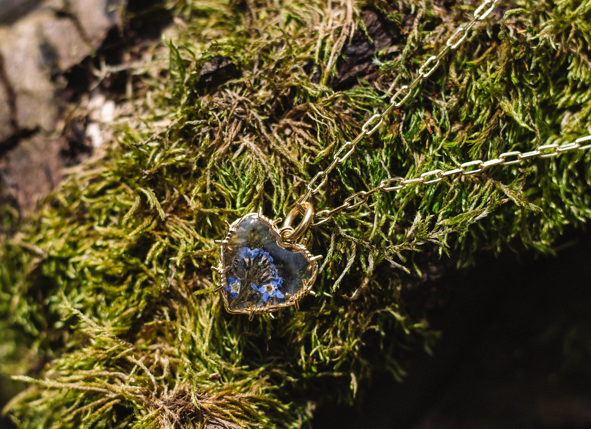 Material: 24k Gold plated brass I claw clasp I dried forget-me-not flowers I resin